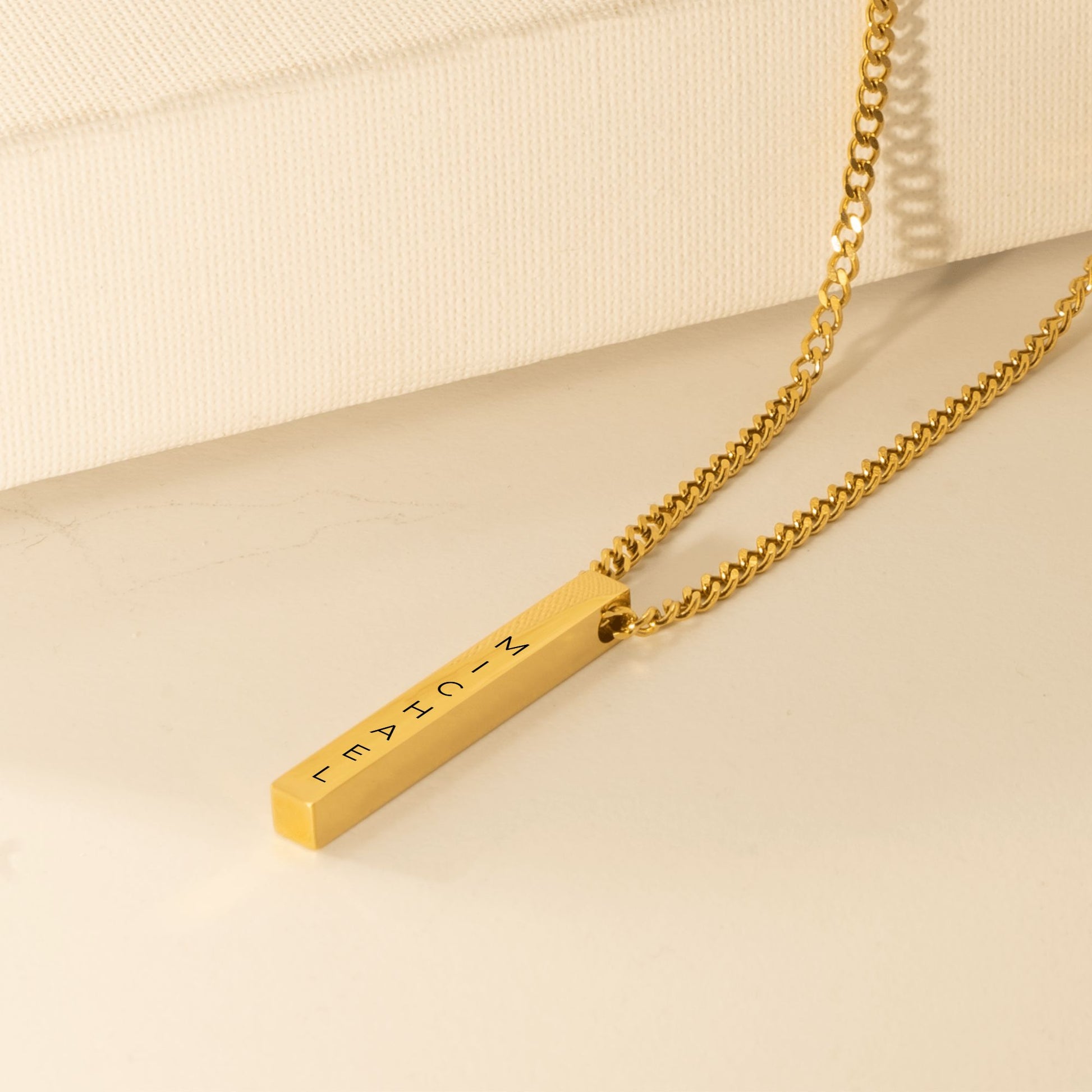 Diese elegante, personalisierte Bar-Kette ist ein ganz besonderes Geschenk für deinen Sohn. Sein Name wird vertikal eingraviert – klar, präzise und dauerhaft. Optional kannst du eine zusätzliche Seitengravur hinzufügen (Datum, Initialen, kurzer Text).