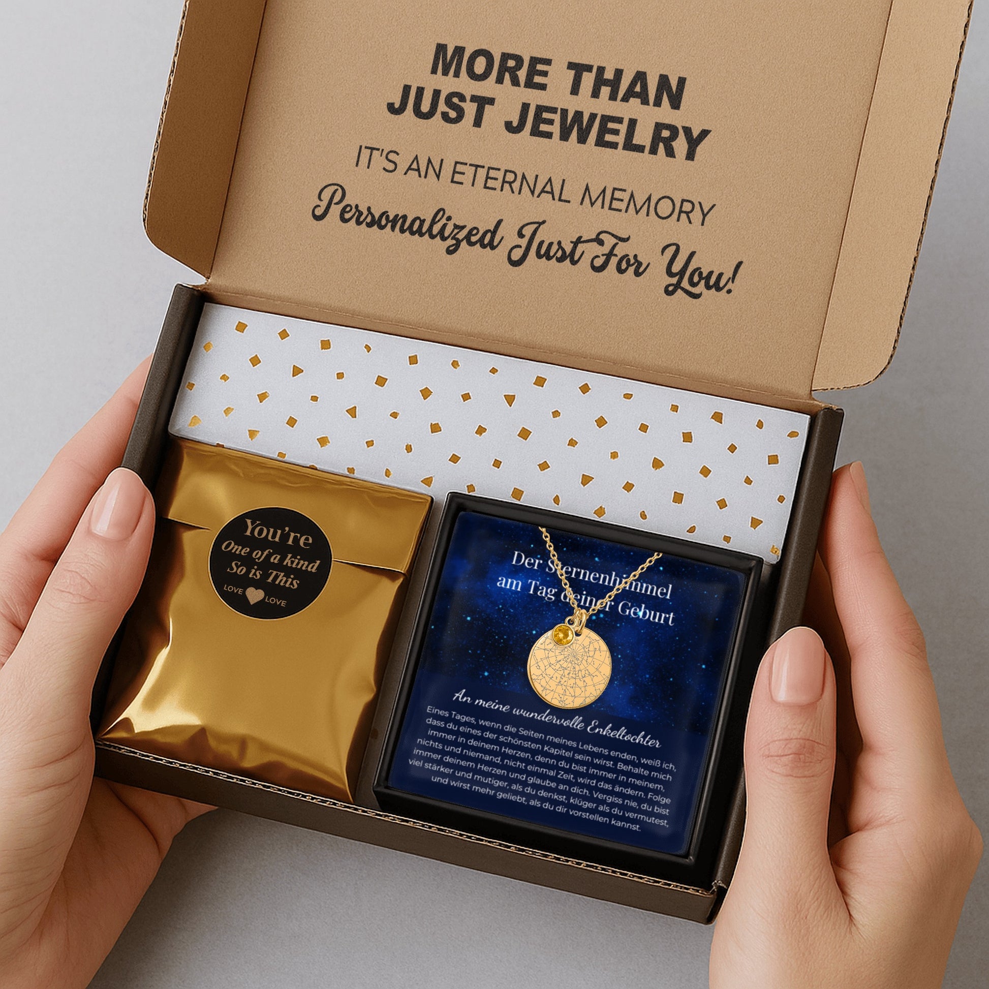 Meine Enkeltochter liebt die Kette über alles. Als sie die Karte las und realisierte, dass es der Sternenhimmel ihres Geburtstags ist, kamen ihr sofort die Tränen. Dieser Moment hat auch mich tief berührt. Ein unglaublich bedeutungsvolles und persönliches Geschenk — absolut empfehlenswert!