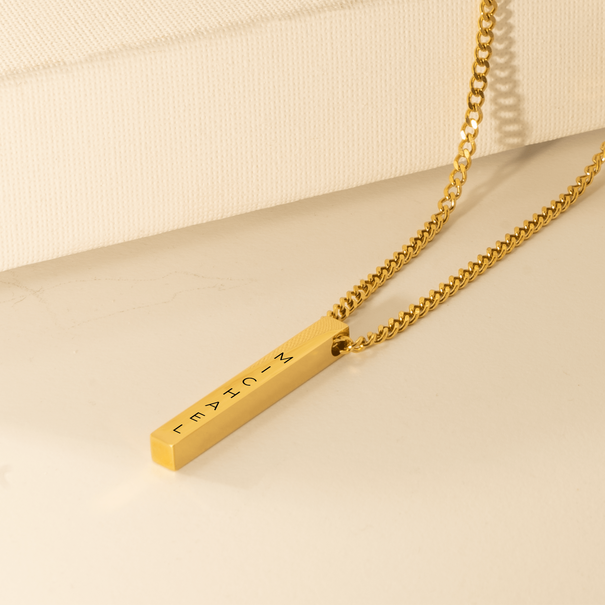 Diese elegante, personalisierte Bar-Kette ist ein ganz besonderes Geschenk für deinen Enkelsohn. Sein Name wird vertikal eingraviert – klar, präzise und dauerhaft. Optional kannst du eine zusätzliche Seitengravur hinzufügen (Datum, Initialen, kurzer Text).