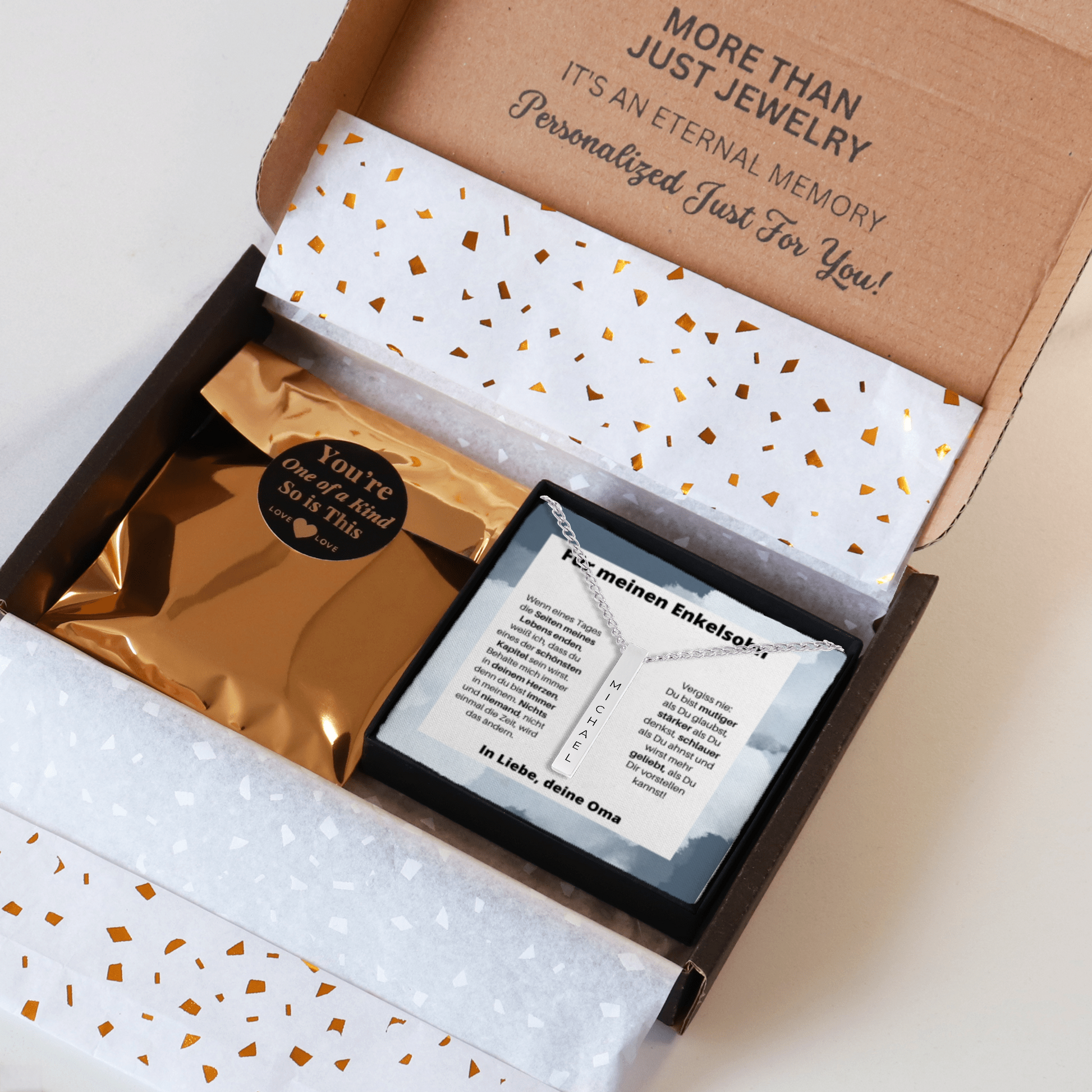 Diese elegante, personalisierte Bar-Kette ist ein ganz besonderes Geschenk für deinen Enkelsohn. Sein Name wird vertikal eingraviert – klar, präzise und dauerhaft. Optional kannst du eine zusätzliche Seitengravur hinzufügen (Datum, Initialen, kurzer Text).