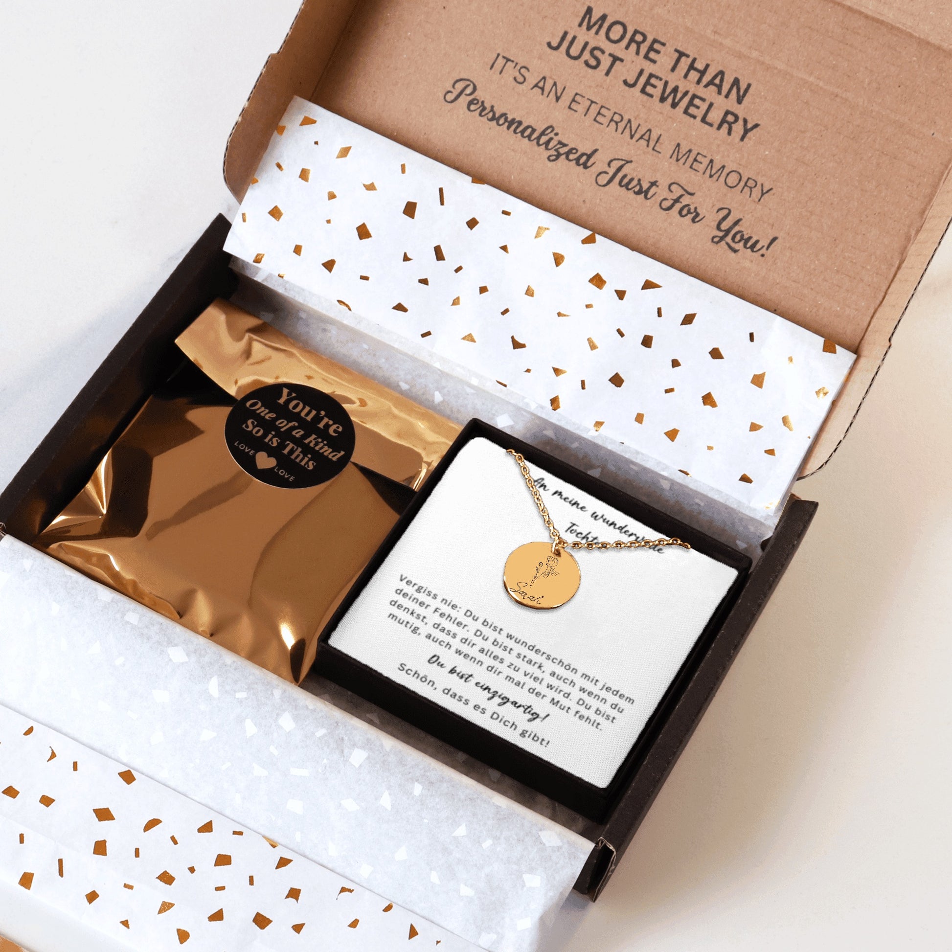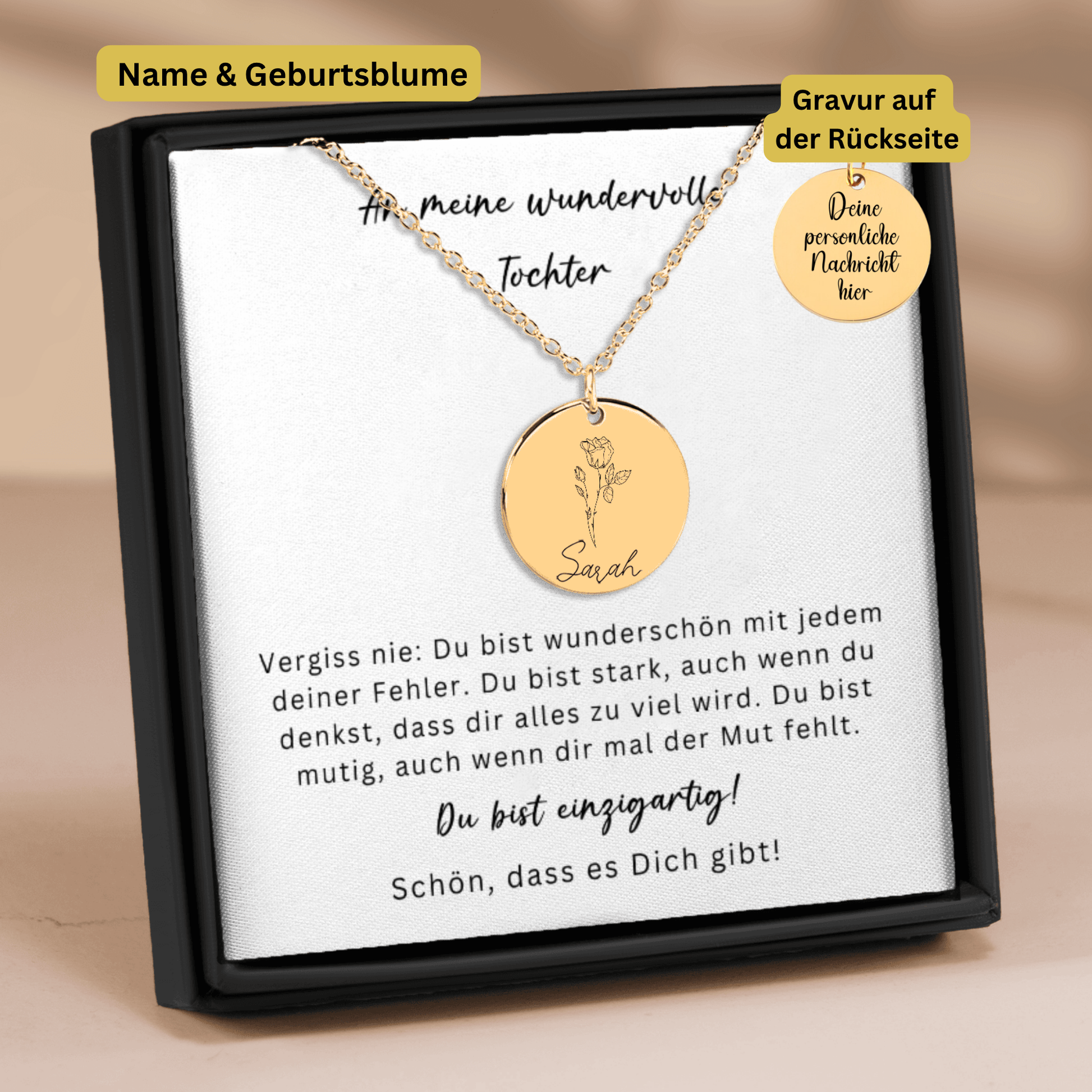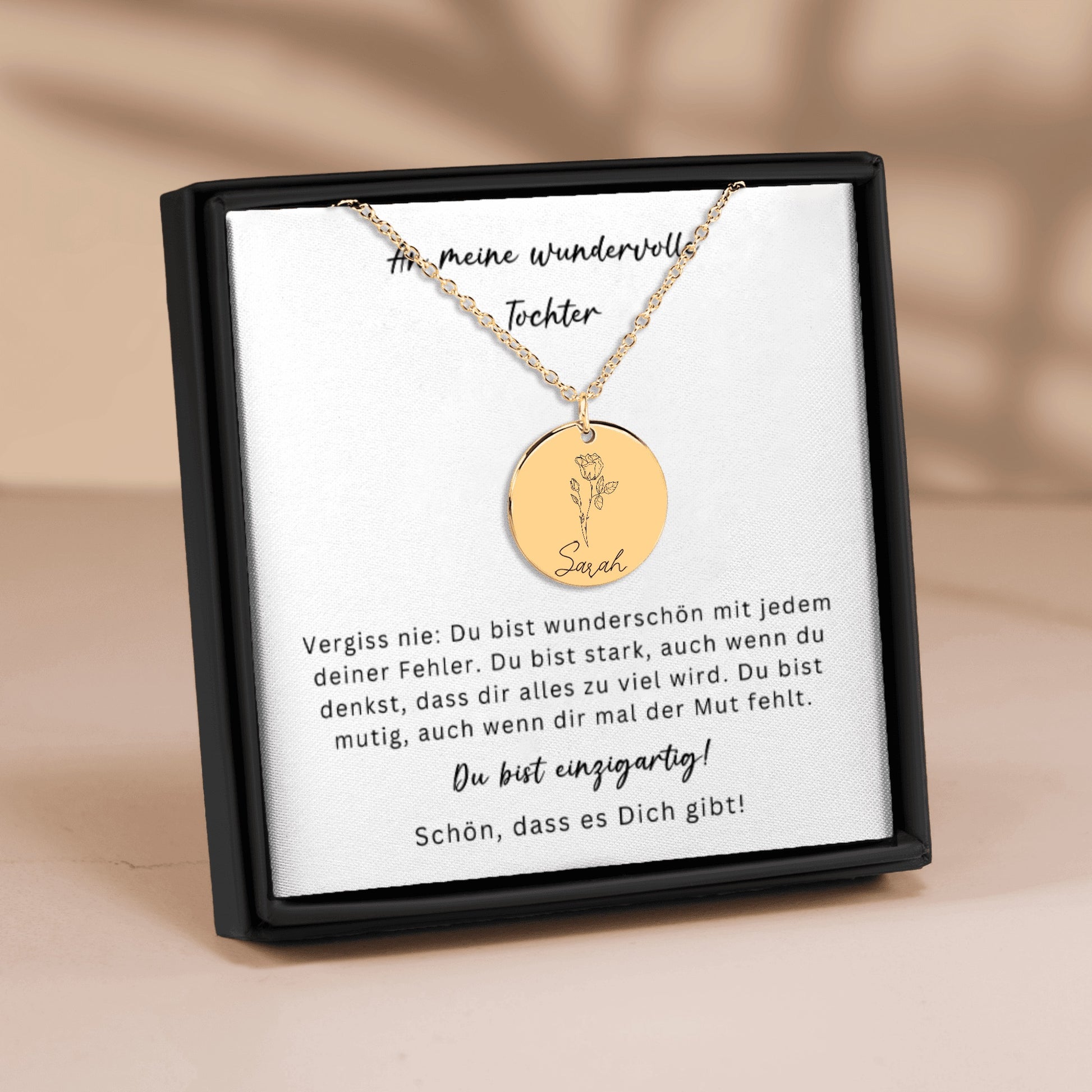 Diese Geburtsblumen Namenskette ist ein bedeutungsvolles Geschenk für deine Tochter – ein Schmuckstück, das Stärke, Liebe und Wertschätzung widerspiegelt. Auf der Vorderseite wird die Geburtsblume ihres Monats zusammen mit ihrem Namen graviert. Auf der Rückseite findet eine persönliche Wunschgravur Platz – bis zu 25 Zeichen. 💛