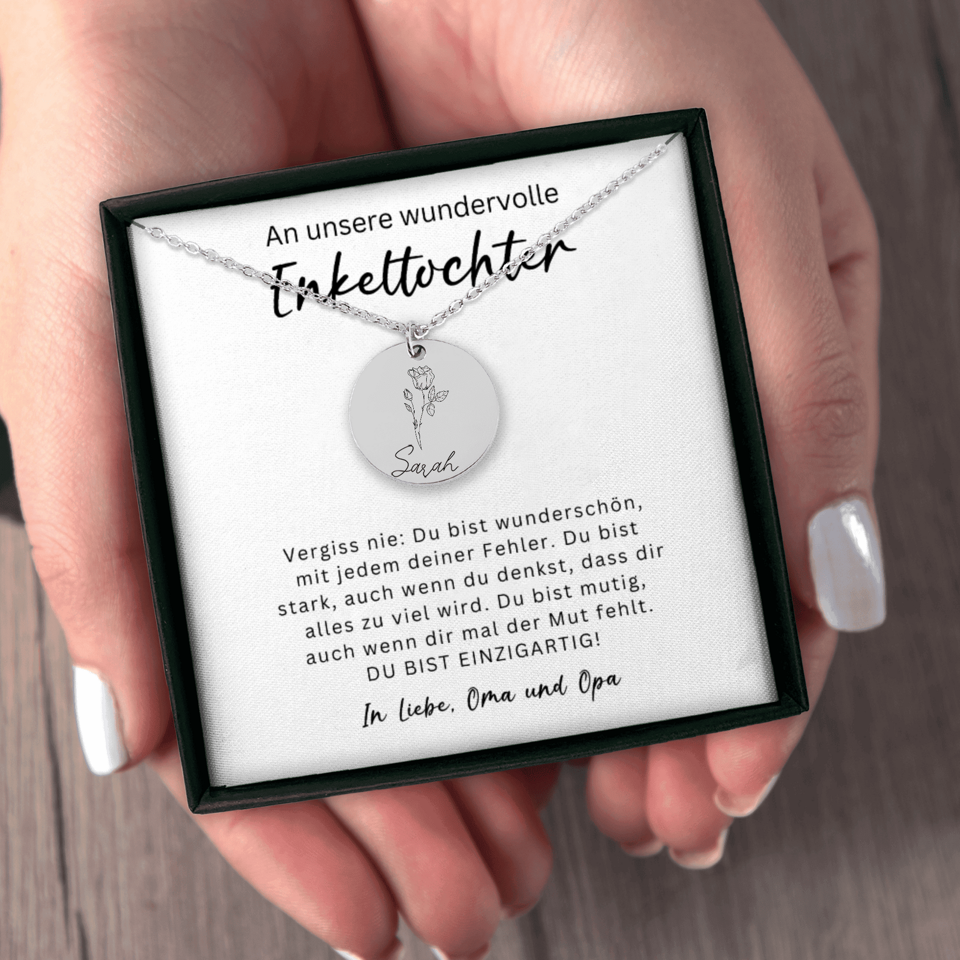 Diese Geburtsblumen Namenskette ist ein bedeutungsvolles Geschenk für deine Enkeltochter – ein Schmuckstück, das Stärke, Liebe und Wertschätzung widerspiegelt. Auf der Vorderseite wird die Geburtsblume ihres Monats zusammen mit ihrem Namen graviert. Auf der Rückseite findet eine persönliche Wunschgravur Platz – bis zu 25 Zeichen. 💛