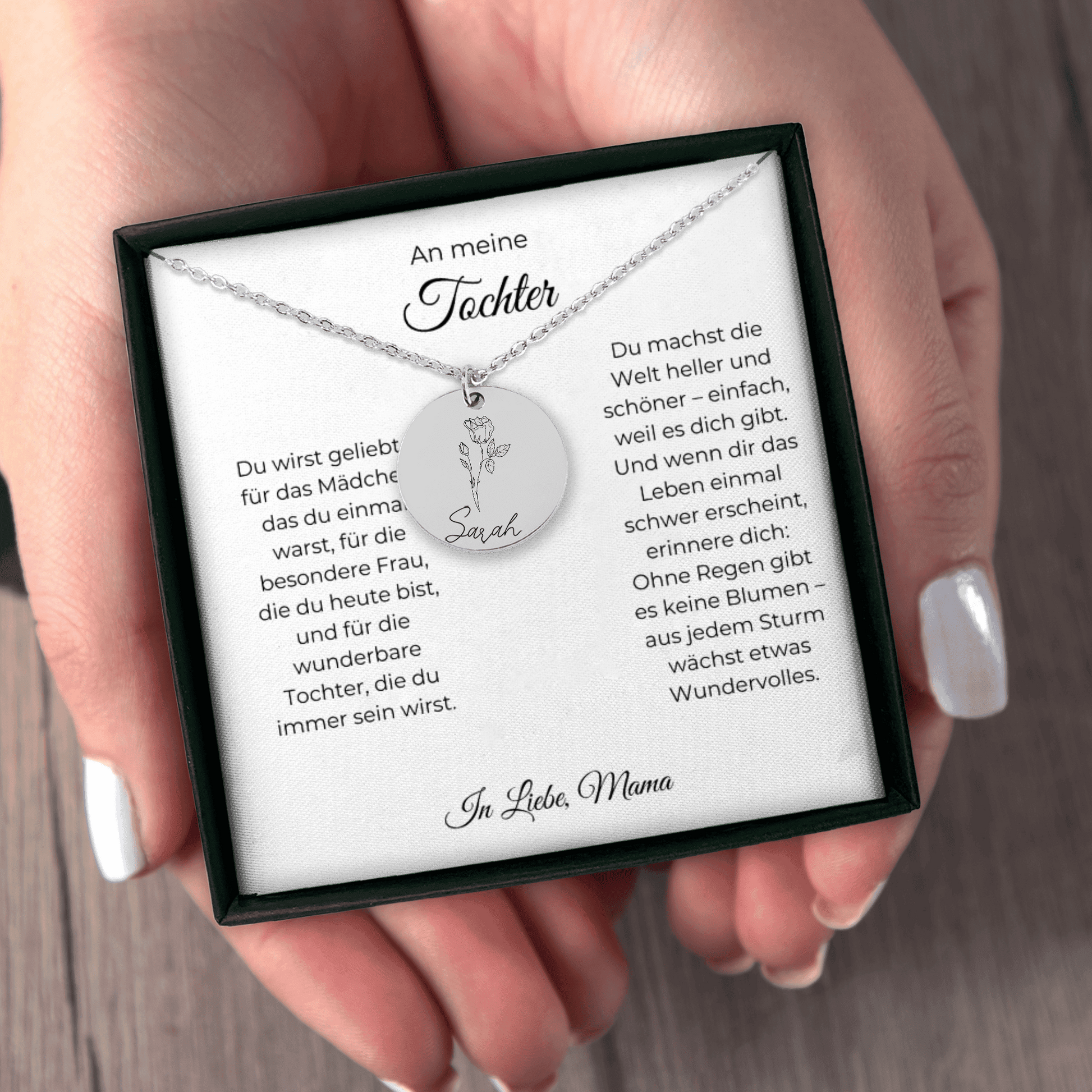 Diese Geburtsblumen Namenskette ist ein bedeutungsvolles Geschenk für deine Tochter – ein Schmuckstück, das Stärke, Liebe und Wertschätzung widerspiegelt. Auf der Vorderseite wird die Geburtsblume ihres Monats zusammen mit ihrem Namen graviert. Auf der Rückseite findet eine persönliche Wunschgravur Platz – bis zu 25 Zeichen. 💛
