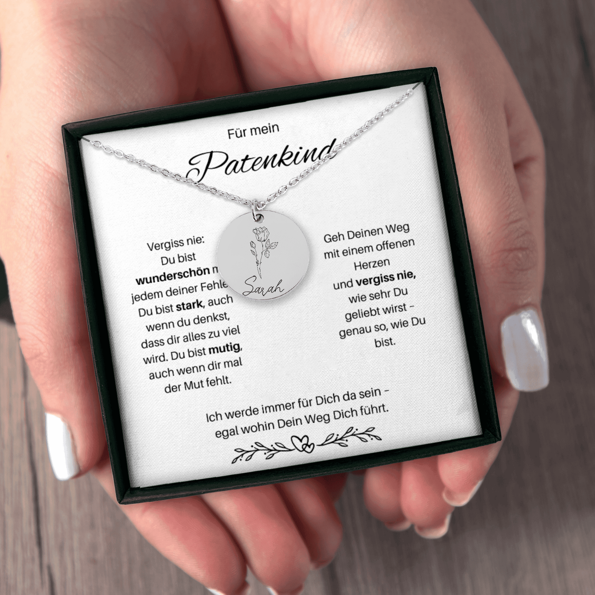 Diese Geburtsblumen Namenskette ist ein bedeutungsvolles Geschenk für deine Patenkind – ein Schmuckstück, das Stärke, Liebe und Wertschätzung widerspiegelt. Auf der Vorderseite wird die Geburtsblume ihres Monats zusammen mit ihrem Namen graviert. Auf der Rückseite findet eine persönliche Wunschgravur Platz – bis zu 25 Zeichen. 💛