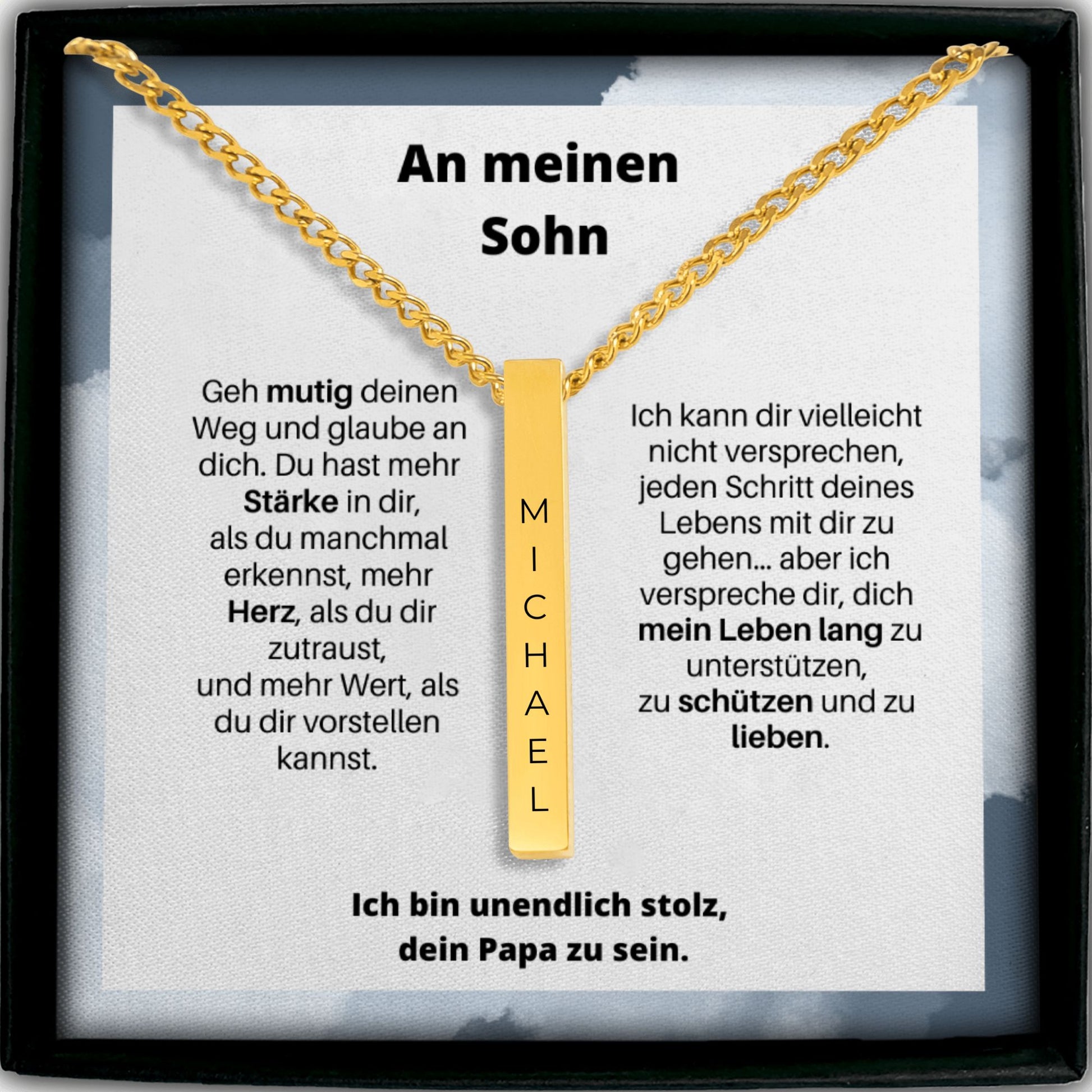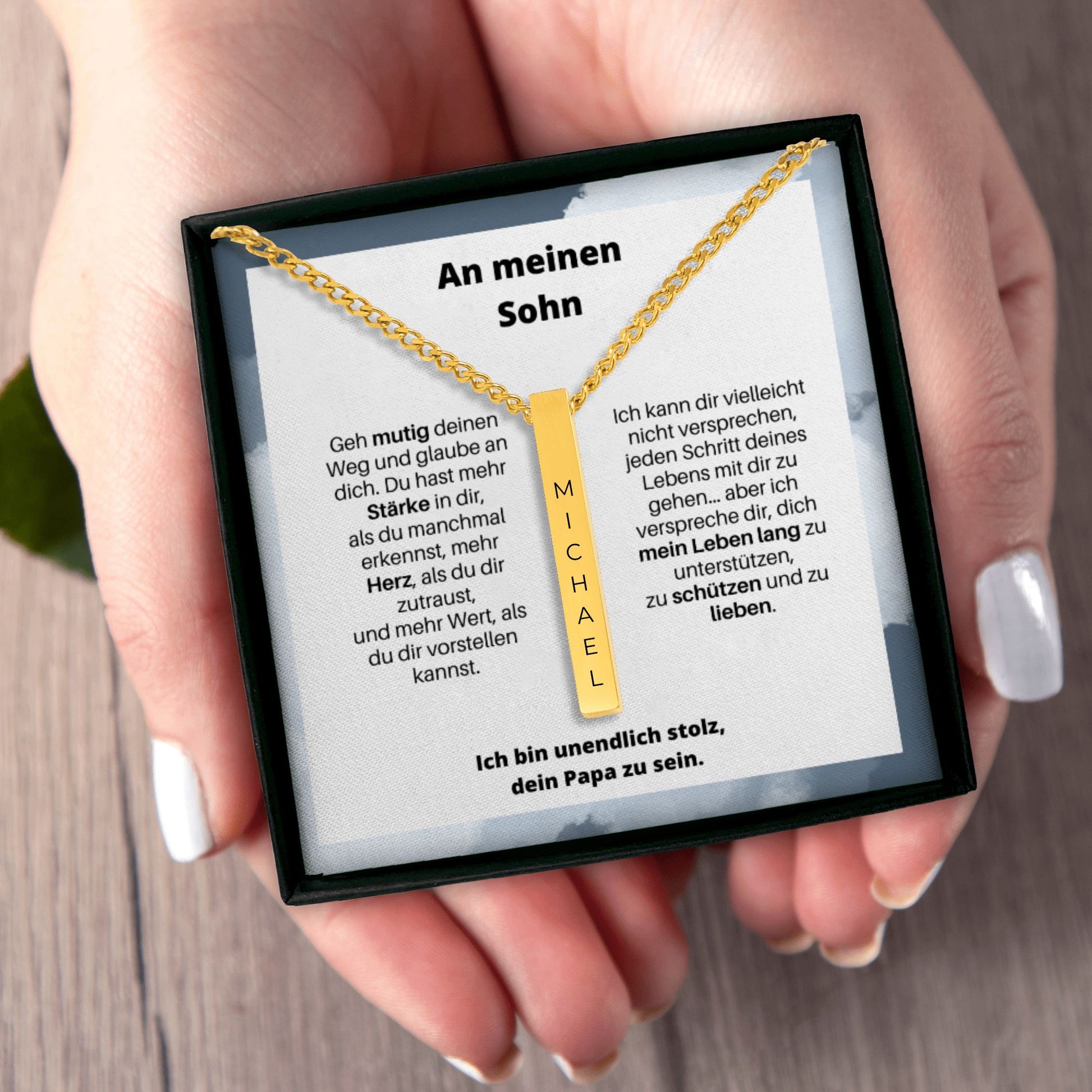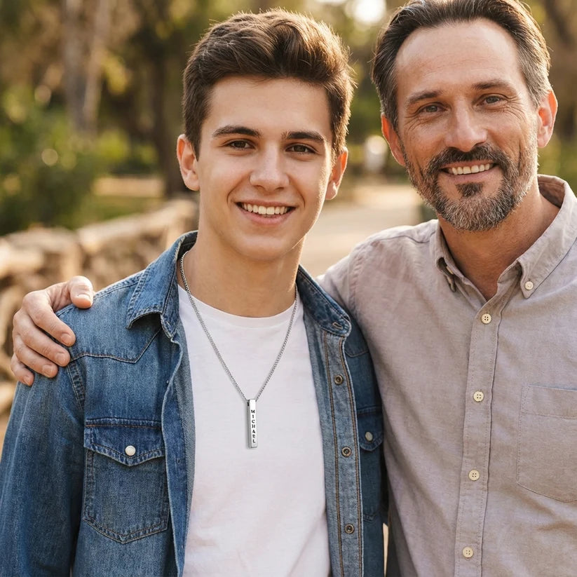Diese elegante, personalisierte Bar-Kette ist ein ganz besonderes Geschenk fĂŒr deinen Sohn. Sein Name wird vertikal eingraviert â klar, prĂ€zise und dauerhaft. Optional kannst du eine zusĂ€tzliche Seitengravur hinzufĂŒgen (Datum, Initialen, kurzer Text).