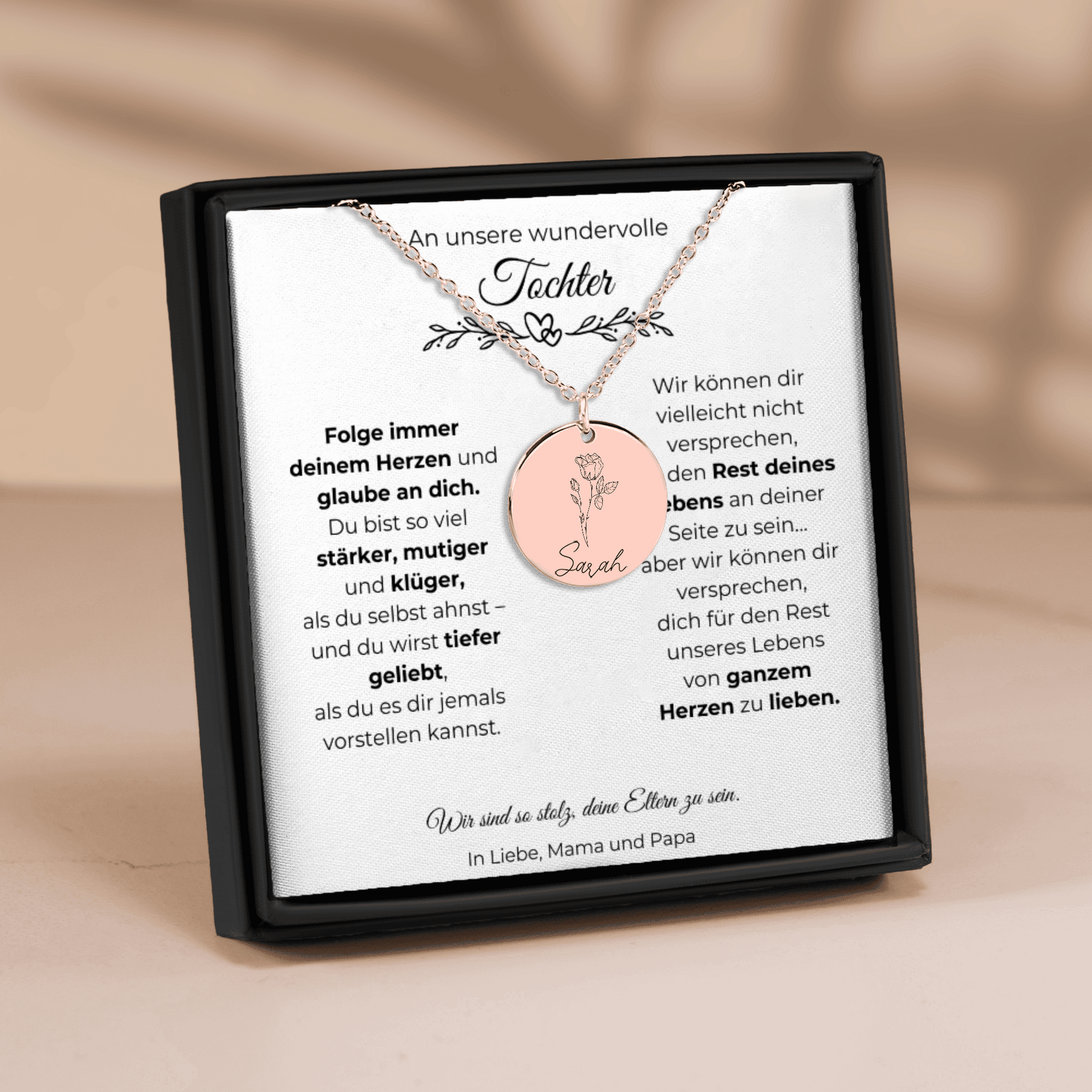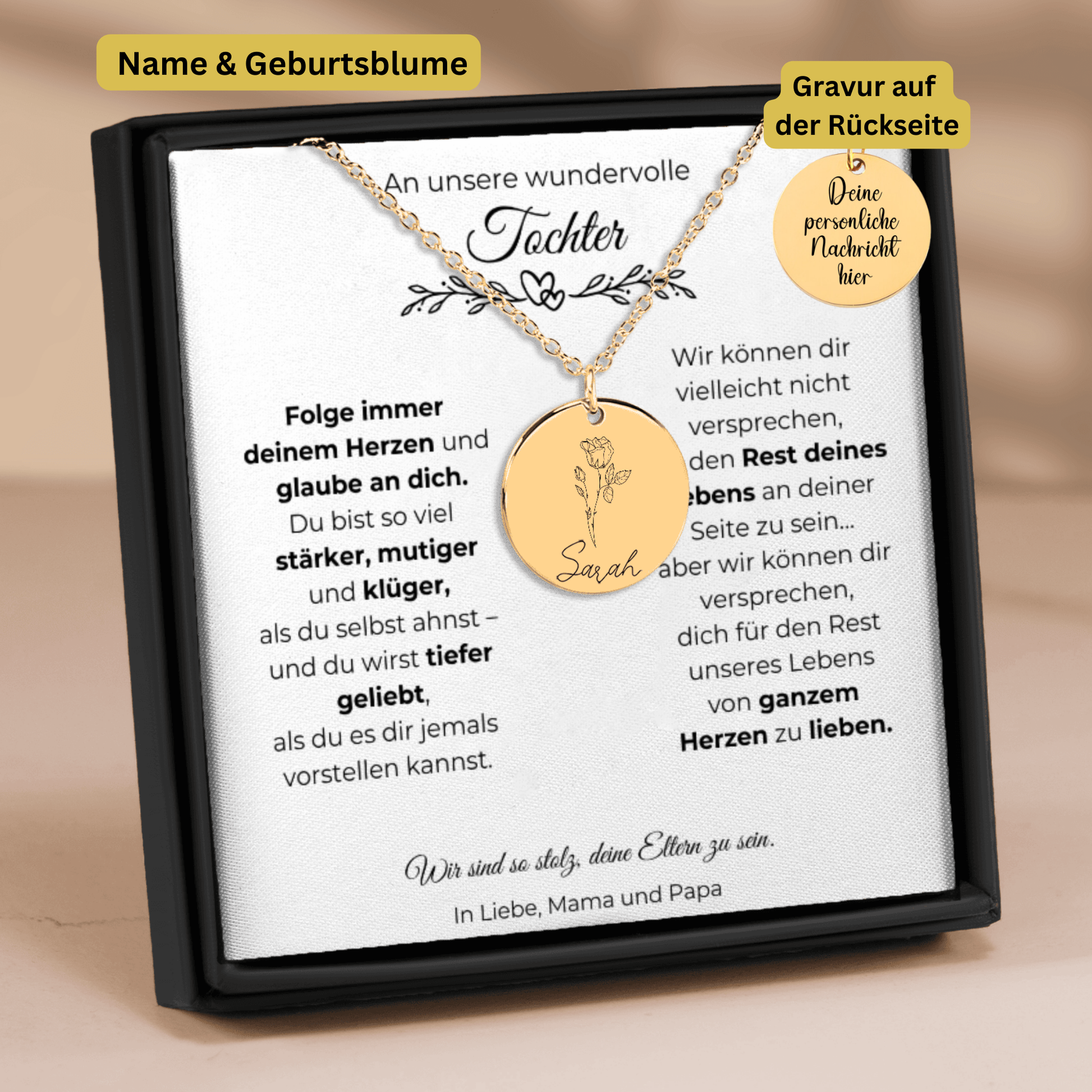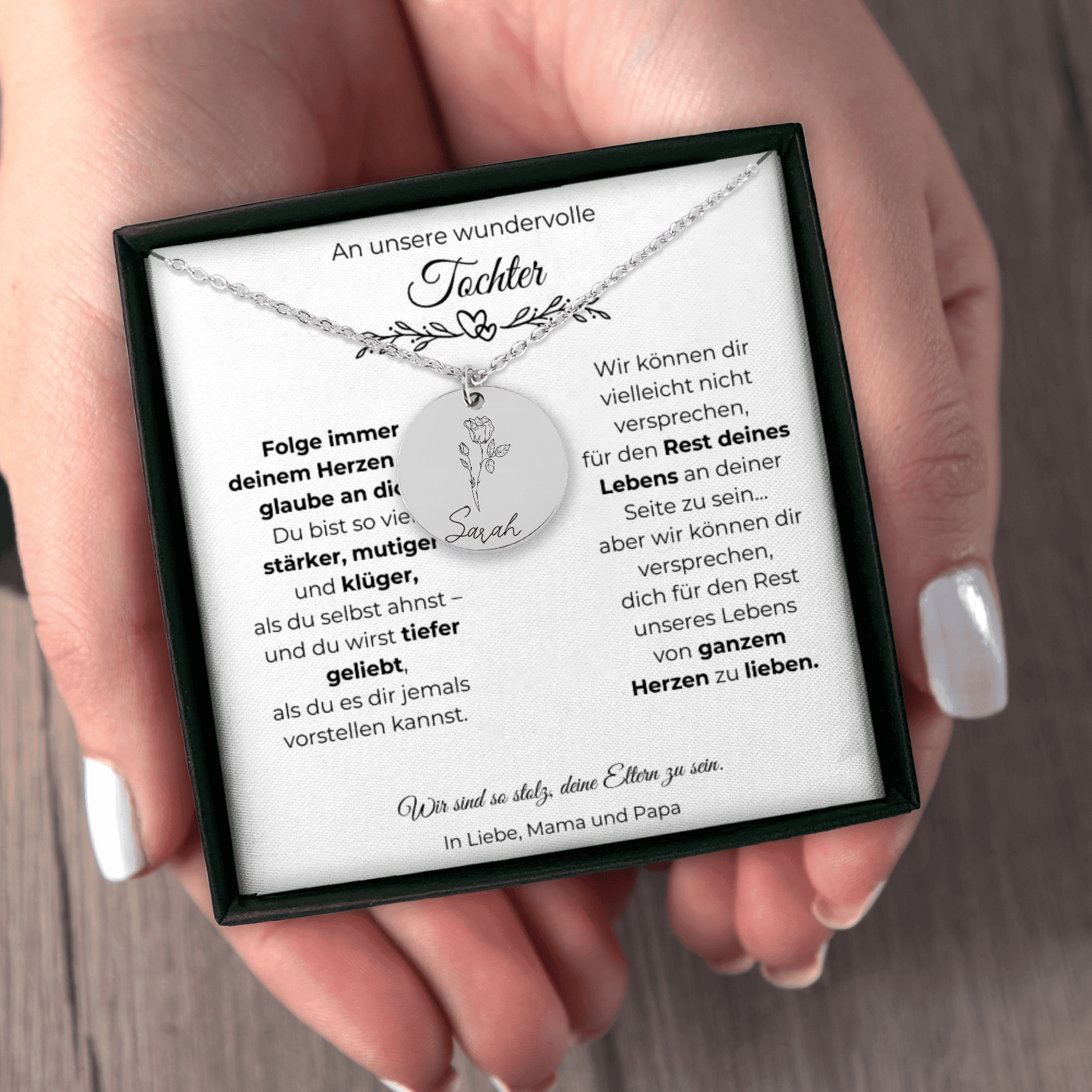 Diese Geburtsblumen Namenskette ist ein bedeutungsvolles Geschenk für deine Tochter – ein Schmuckstück, das Stärke, Liebe und Wertschätzung widerspiegelt. Auf der Vorderseite wird die Geburtsblume ihres Monats zusammen mit ihrem Namen graviert. Auf der Rückseite findet eine persönliche Wunschgravur Platz – bis zu 25 Zeichen. 💛